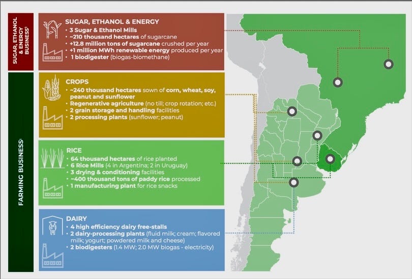 The company cultivates rice on 64,000 hectares of mostly leased land and owns six rice mills, four in Argentina and two in Uruguay, which process approximately 400,000 metric tonnes annually. It also owns a manufacturing plant for rice snacks.