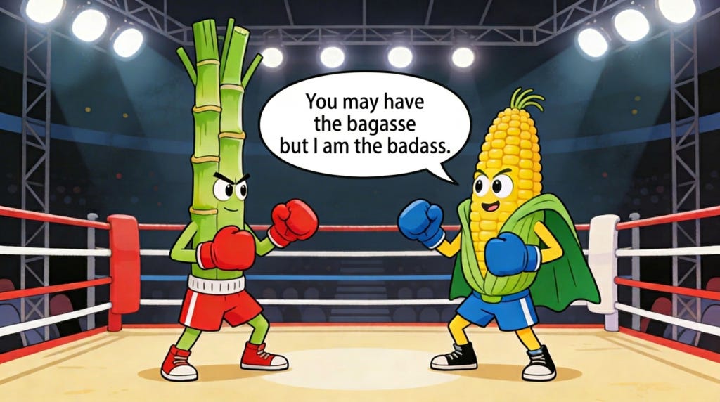 However, by their nature, these flex operations tend to be much smaller than dedicated corn‑only ethanol plants. Sugarcane is bulky and requires heavy pre‑treatment: washing, preparation, and handling of bagasse, with relatively modest ethanol yields per tonne of harvested material. Corn arrives as a clean, dense commodity, allowing plants to scale to very large capacities from a much smaller physical throughput.